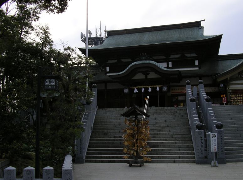 몽고 내습의 때, 이요국으로부터 방인(앞숲)으로서 출병한 코노 일족이 전승을 기념해, 우사 야와타의 신을 권진한 신사.「승전(장군)씨」의 통칭으로 필승 기원·합격 기원·학업 성취의 신으로 되어 있다.