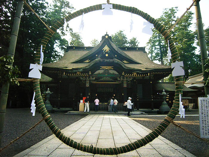 楼門をくぐると芽の輪と拝殿が見えた。芽の輪とは、「芽の輪くぐり」と言い、芽(ちがや)で作った輪をくぐる行事でこの半年の罪や穢れを祓い残り半年の無病息災を祈願するというもの。夏越祓(なごしのはらえ)の神事とも言う。日本独特の風習かも