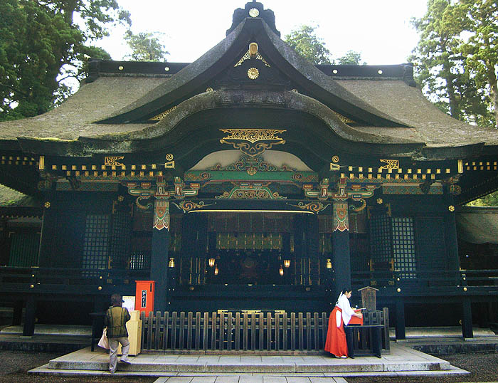 拝殿、黒塗りの重厚な感じの建物、江戸初期的な色使い。1700年再建。