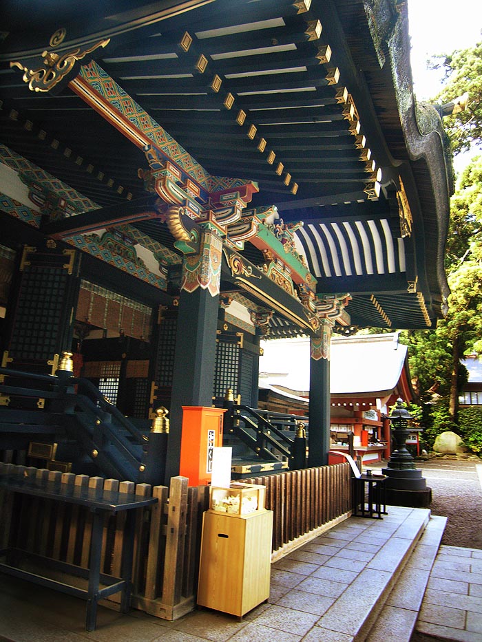 黒と金が主体の拝殿。彫刻が少ないのも江戸初期の桃山時代風。