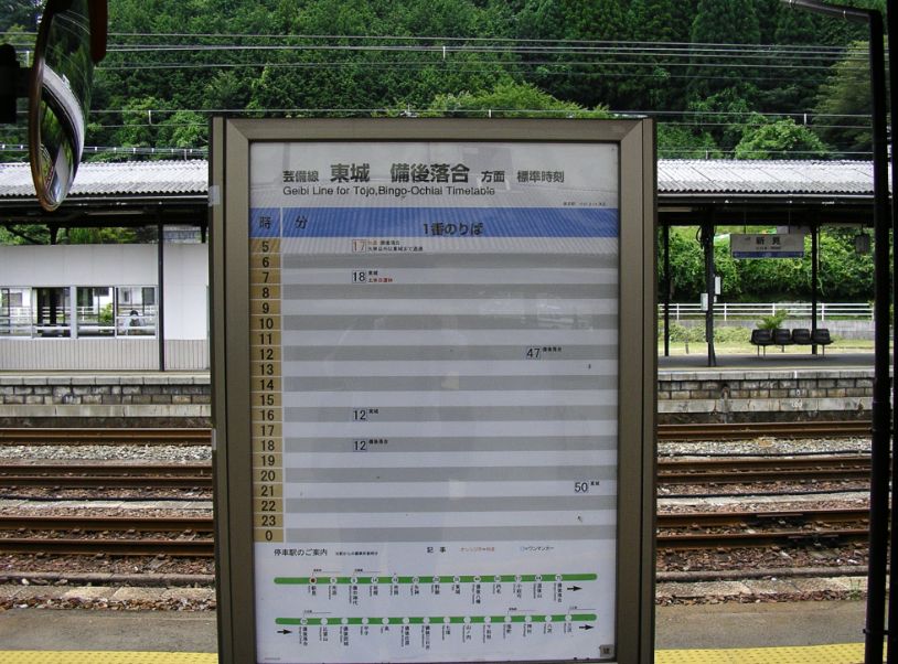 新見駅1番乗り場の芸備線の時刻表¥です。昼の時間帯は12時47分の列車しかありません^^;