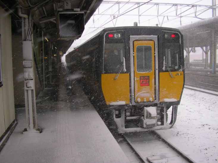「鳥取行きの快速とっとりライナーは強風・大雪により30分ほど遅れています」