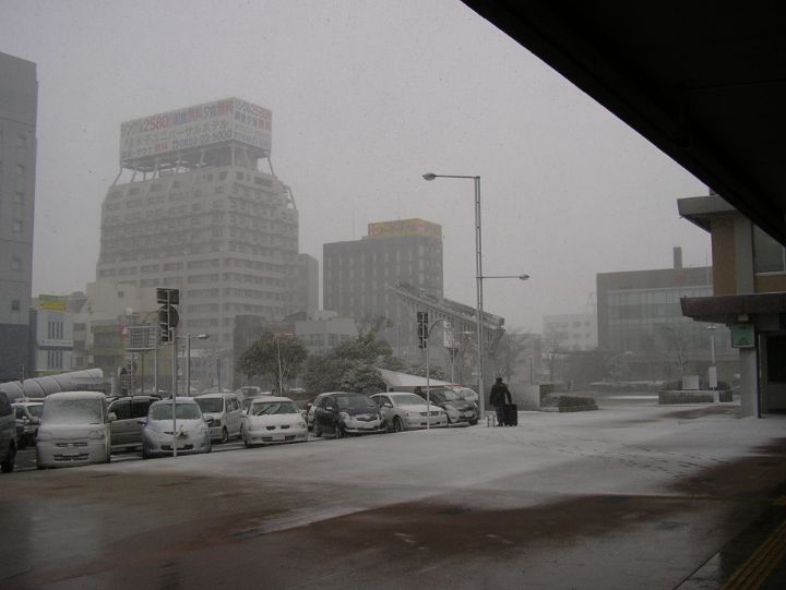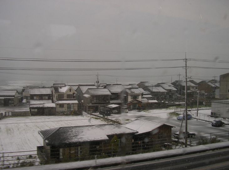 「톳토리행의 쾌속과 새라이너는 강풍·폭설에 의해 30분 정도 늦습니다」