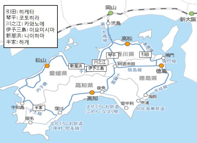 여기서 소개한 역의 위치입니다.(이요 와케역은 마츠야마역의 조금 북쪽입니다.)