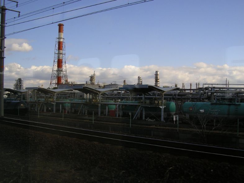 山口県にも劣らない石油工場群です。石油を運ぶための貨車や石油工場へと続く線路なども見られます。