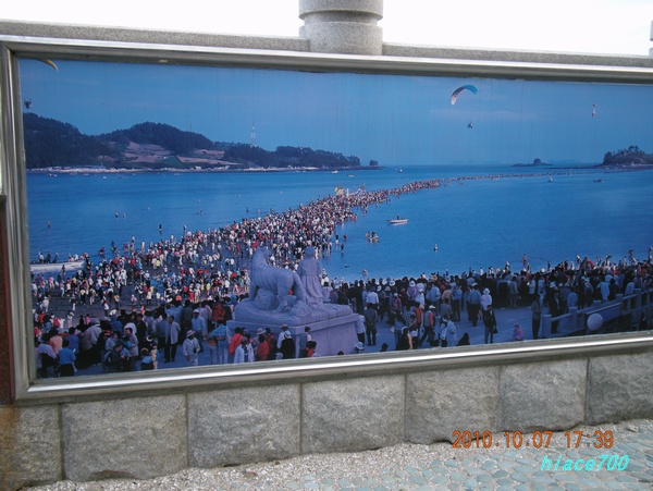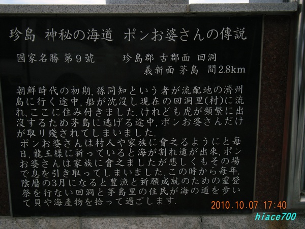 年に2回、3月頃と9月頃に珍島と茅島里(モドリ)の間、約2,8Kmに海が割れ、道が出来る。