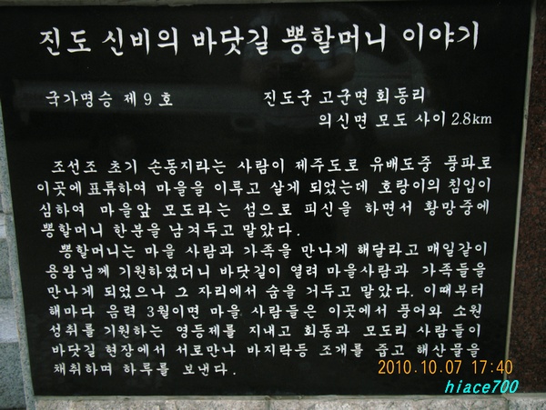 1년에 2회, 3월 무렵과 9월 무렵에 진도와 모시마자토(모드리)의 사이, 약 2, 8 Km에 바다가 갈라지고 길을 생긴다.