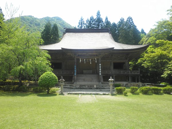 웅대한 나가오산을 배경으로, 초록에 싸인 본당이 아름답다.