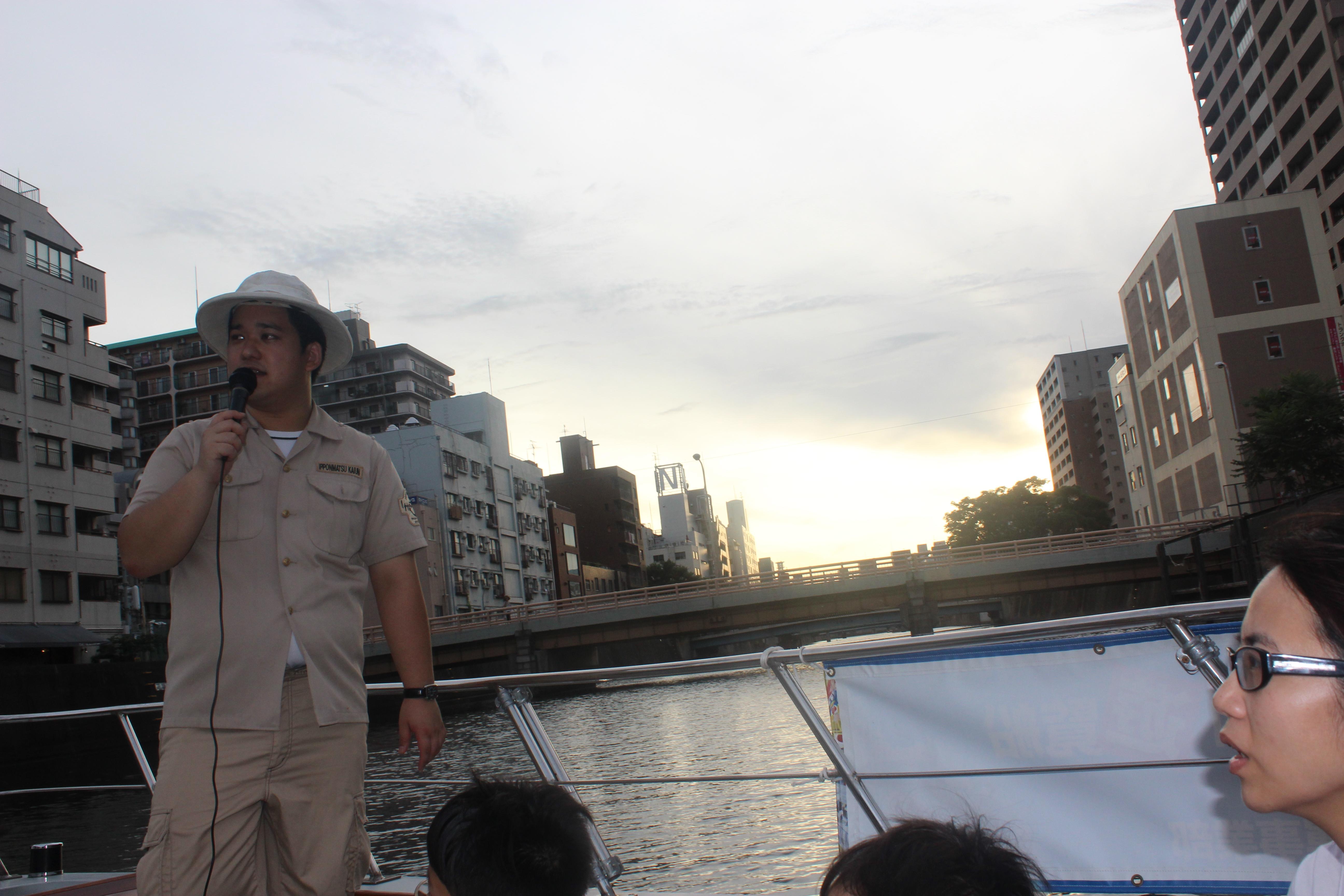 がガイド兄さん(型)が遊覧船に乗りながらカフェーあるいはゴリエある