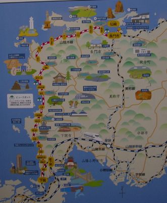 こちらが路線図です。(長門市駅から伸びている赤い路線は山陰本線です。)