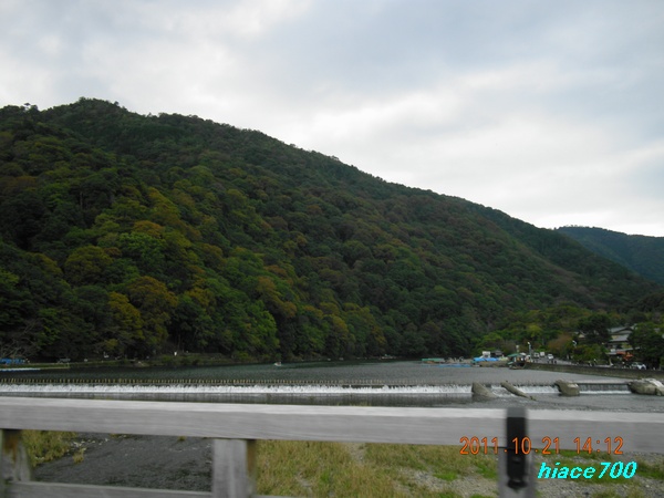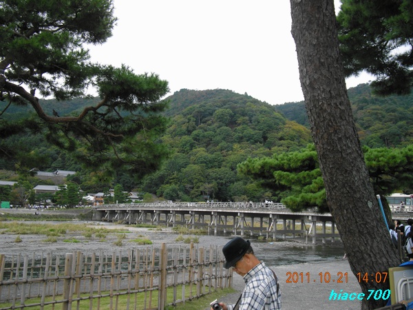 카츠라가와에 걸리는 도케츠교우를 건너, 아라시야마를 바라본다.