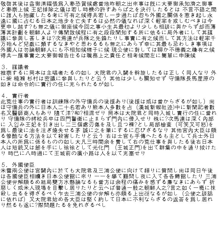 乙未事変が裂けたすぐ翌日作成されたまた一件の報告書が日本本国で飛んで来た. 朝鮮政府内部(内部, このごろの内務省) 顧問の職責を持っていたイシズカエゾ(石塚英蔵)が日本政府の法制局長官であるスエマスがネズミ(末松謙澄)に別途に送った長文の報告書だった.