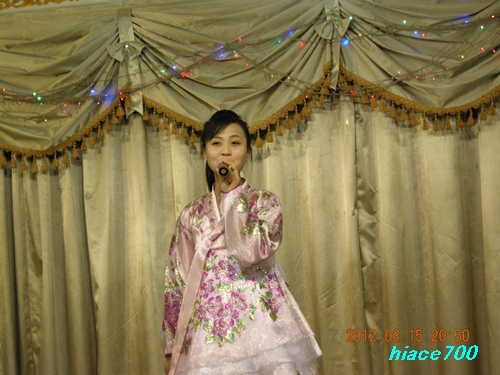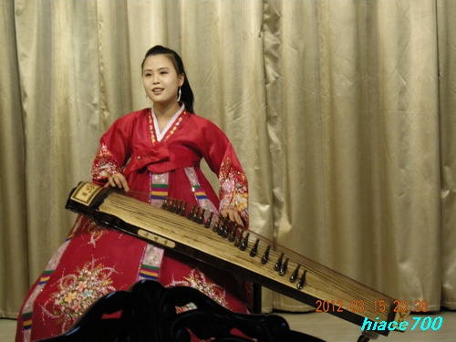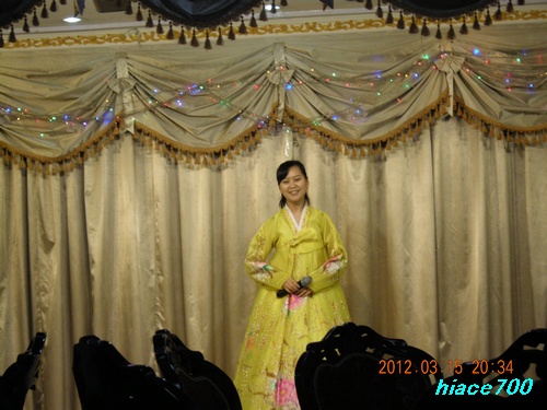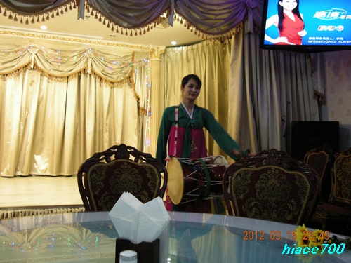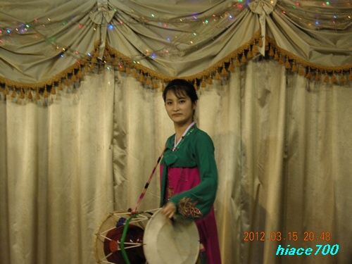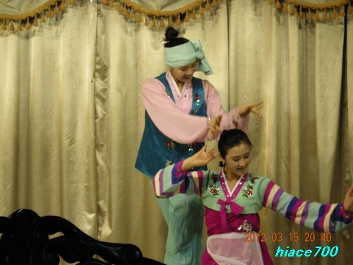 給仕姿の時は駄目であった写真撮影も自由に許される。オイラが勝手に付けた団長に日本語で話すと、「朝鮮語でお願いします」という。