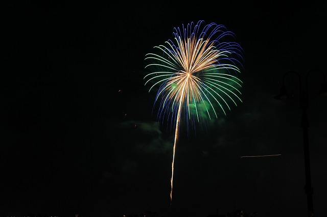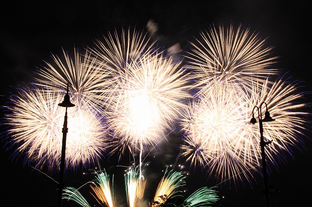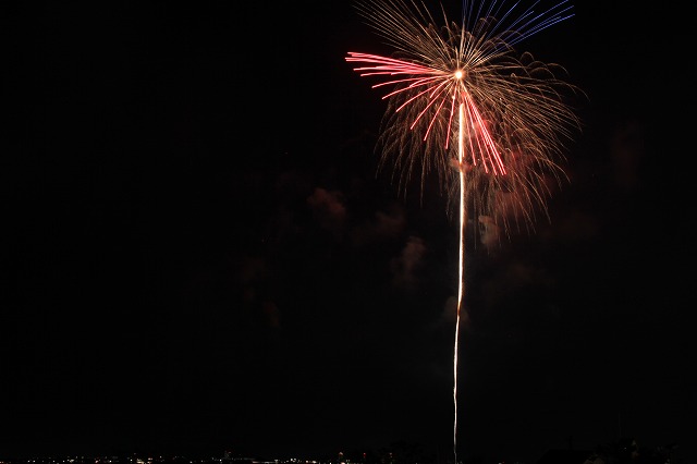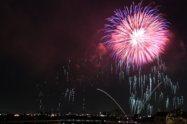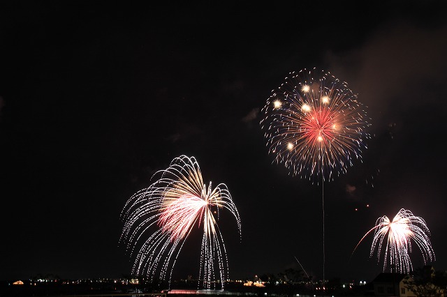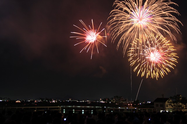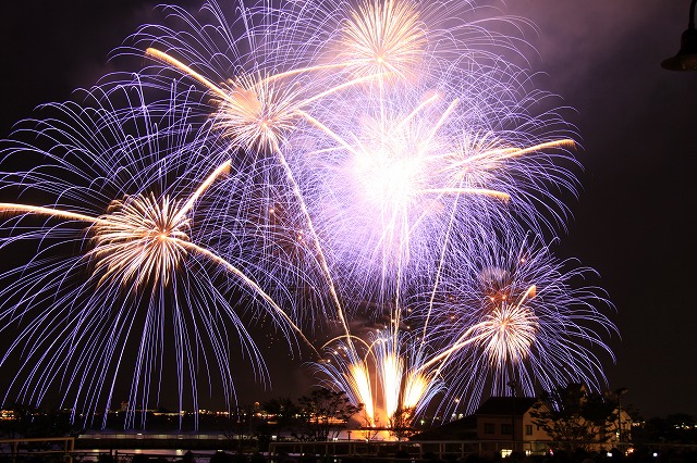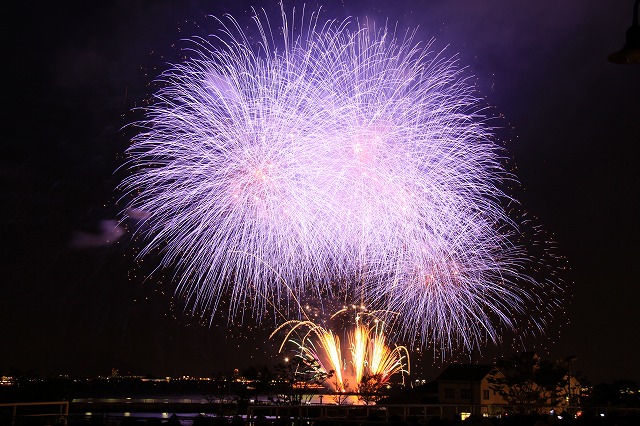 (宇治花火だと、ほぼ同じ場所で花開くのです)