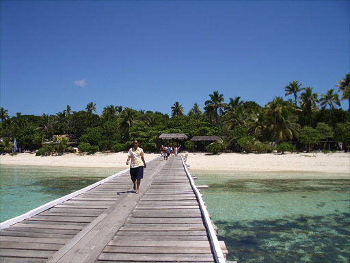 MANA島の飛行場から、トラクターに引かれてホテルへ移動中。