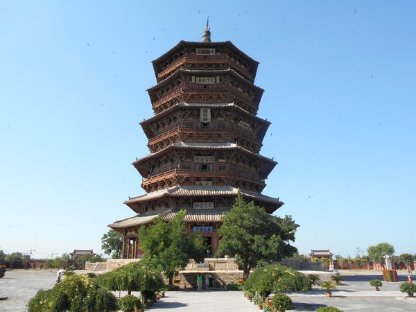 少し傾いた仏宮寺釈迦塔。応県に存在するので、応県木塔の名前で知られます。1056年の建立。世界で最も高い木造建築で、高さは63m(基壇4m)。残念ながら登れません。