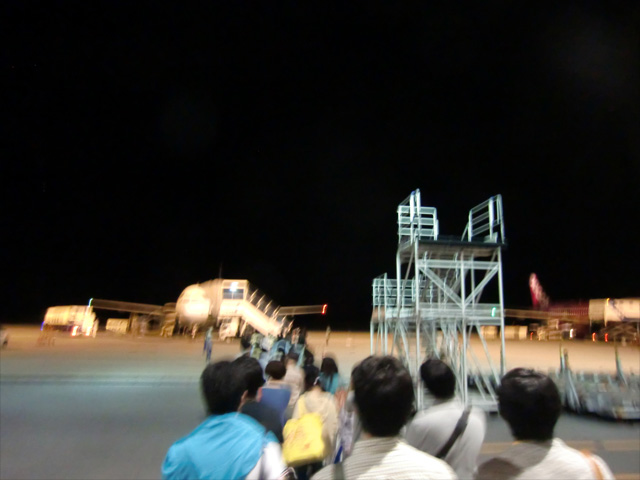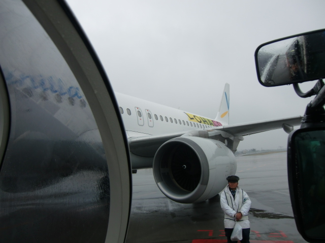 飛行機のそばで降り、タラップを登ってやっと機内へ。