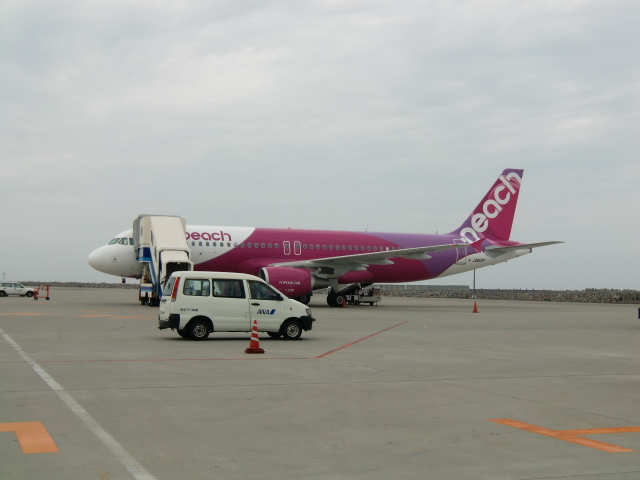 近くに停まっていたピーチの飛行機。