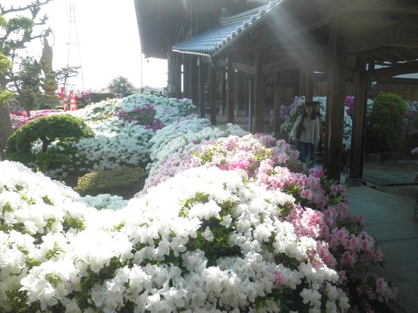 ツツジウォールと大雄宝殿のしころ屋根。観音さまはちょっと要らないかなw 写真のツツジウォールの角っこだけ、赤いツツジがありました。