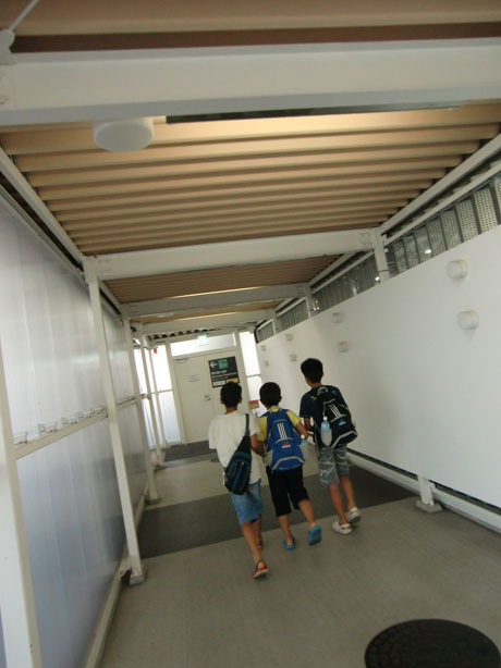 簡素な通路を歩く、子どもたち。
