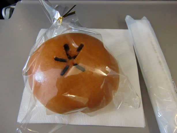 機内で250円で販売しています。ちゃんと美味しいですが、街のパン屋で普通に・・・というレベル。高いし。