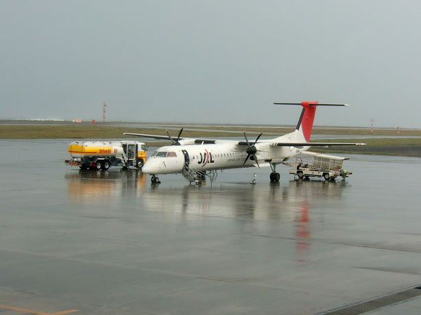 ボーディングブリッジからJALのボンバルディアが見えます。近隣の島への足なのでしょう。