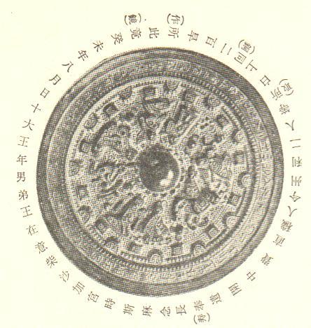 癸未年八月日十 大王年 男弟王 在意柴沙加宮時 斯麻 念長壽 遺開中費直穢人今州利二人等 取白上銅二百旱 作此鏡