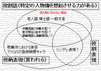 4. こうしてみると「萌え表¥現」だの「ツンデレ表¥現」だのは、確かに「役割語」ではないかもしれないが「ビジネスシード」という側面も備えているが故に「役柄表¥現」の条件を満たし得るという考え方が立派に通用しそうである。また逆に、当時の文献の中に「老人語」や「御姫様語」といった「役割語」の形成過程がちゃんと記録されてないという事は、あるいはそれが「役柄表¥現」としての要件を満たしていなかったという事を意味するのかもしれない。今後の研究が待たれる所である。