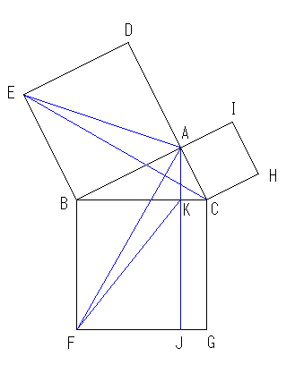 上の二つの正方形の面積を、三角形を利用する事で下の正方形の面積と比較します。それによって上の二つの面積の我が下の正方形の面積に等しい事を証明します。