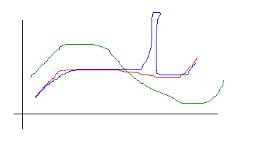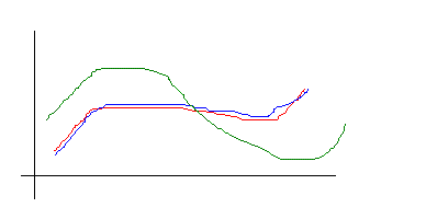 この様になっていた場合、赤の関数により近いのは、青と緑のどちらでしょうか?