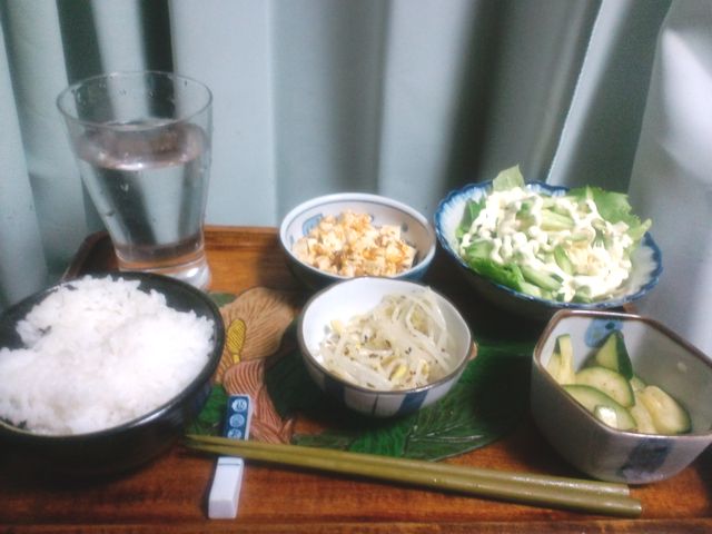 サラダは、ゆでたジャガイモとマカロニ、ゆで卵をマヨネーズで和えて適当にレタスとか胡瓜とか。