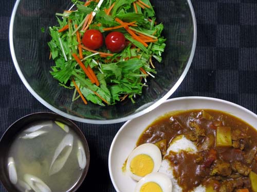 サラダ、ジャガイモと若布の味噌汁、カレーライス。