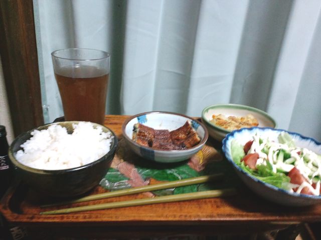( *H*)y-‾‾晩ご飯もボク的に贅沢。やさいオムレツとサラダとウナギなの。