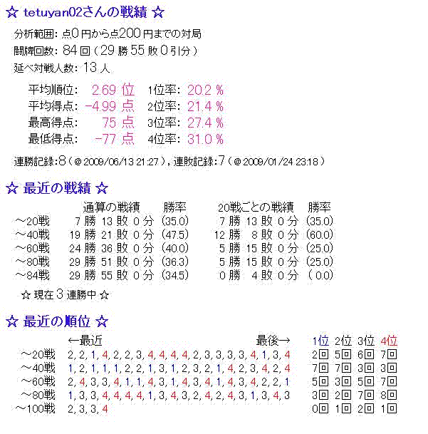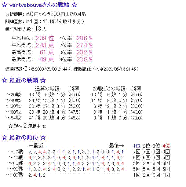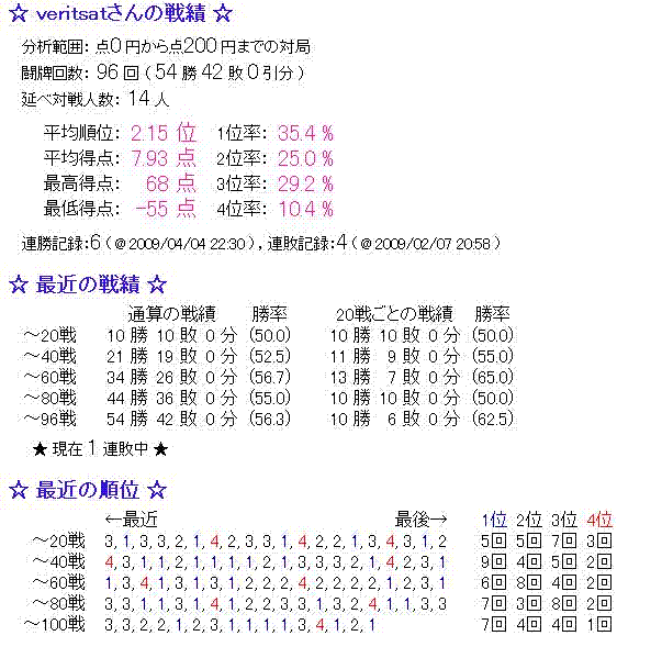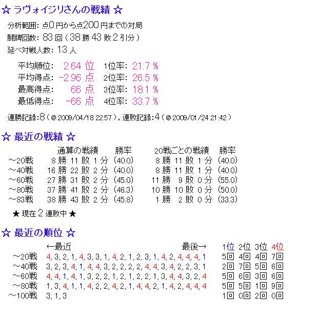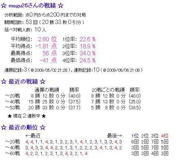 2위율과 4위율이 높습니다.시합수가 적기 때문에 모릅니다만 1 품등곳에서 2위, 3위로 해결되는 (곳)중에 4위로 승부무렵으로의 미스가 많은 것인지도 알려지지 않습니다.대전 성적에서는 거의 전원과 호각의 승부를 하고 있습니다만, 유익뜻씨가 없는 것이 괴롭다.magu응이 천적이 되어 있습니다.