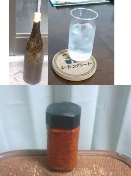 ( ´H`)y-‾‾粗末な自作コチュジャンと、庭の松葉で作ったイヤ飲料。単に辛いだけならジョンやぽるっちに負けてしまうので、テーマは「心にしみる辛さ」で。