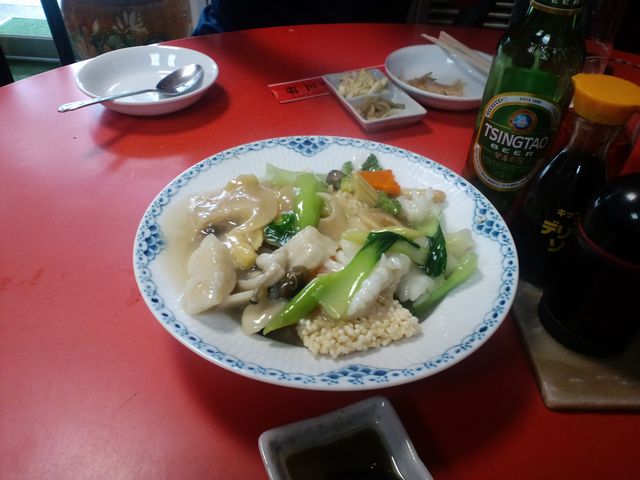 底辺の我々だけど、せっかくなので、冷菜と、おこげのあんかけとか、あんかけチャーハンを分けて食べることに。ビールは青島。