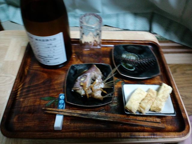덤.저변의 저녁 반주.물고기의 뼈와 조린 생선과 계란 구이로 일본술을.
