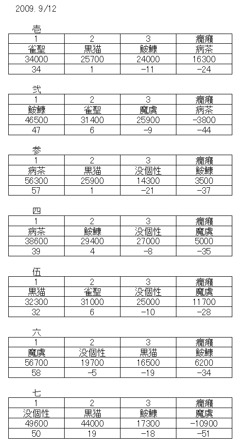 E(ε;・茶・) 癇癪-癇癪-1位-1位。無茶苦茶な順位ですね。それにしても本気を出したはずの没個性さんが3位-3位-3位-2位-1位とは面白くないですね。まさに没個性的な順位です。(それでも最後の最後にトータル+に仕上げるのは流石です)