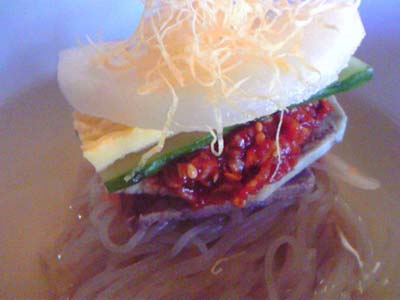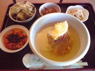 出てきたのは豚肉などの具がきれいに積み上げられ、スープはかなり色薄めだが味自体ははっきりしており、不満なし。麺は蕎麦粉入りの細めのもので歯ごたえもコシも良いのだが、なぜかまわりとくっついていて解しにくい。おかげでヤンニョムが最初からすっかりスープに混じってしまい、味の変化を楽しむどころではなくなってしまった。韓国的には混ぜるのは正しいのかもしれないが。