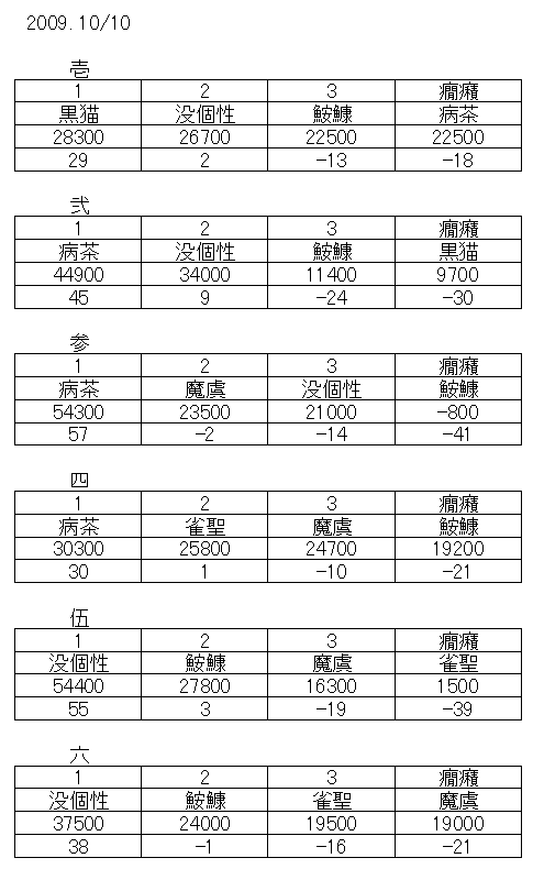三戦目の点数が合わないなぁ…と思っていたら、リーチ棒の分でした。ところで没個性さん。ドラ12とか仰ってましたが、何があったんですか?今度牌譜を見せてください。