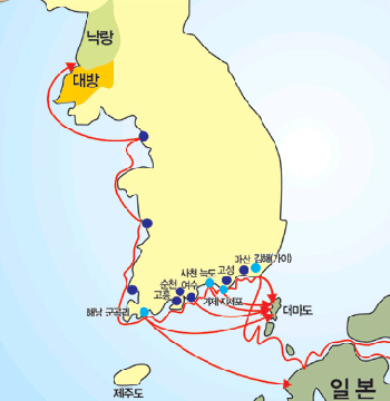絵のように交易路は皆百済と高句麗の港を通さなければならないから百済はこの貿易路を独占して相当な 富を縮尺して, この 富を土台で列島の支配権を占めるようになります.