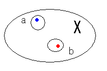 青い点aと赤い点bの周りの丸がそれぞれU,Vです。全体がX、この様に、aの周りを包む開集合、bの周りを包む開く集合で、aとbを分離できてしまう事です。