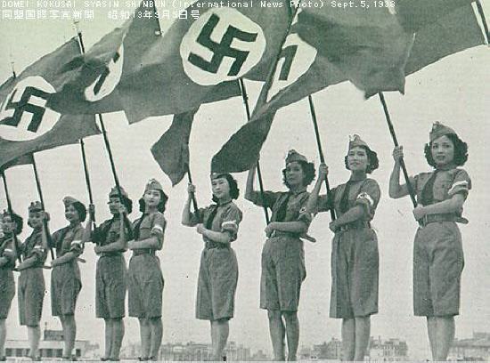 나치 깃발을 흔들고 있는 일본 국민들. 나치 깃발과 일장기가 벽에 함께 걸려있는 것이 보인다.