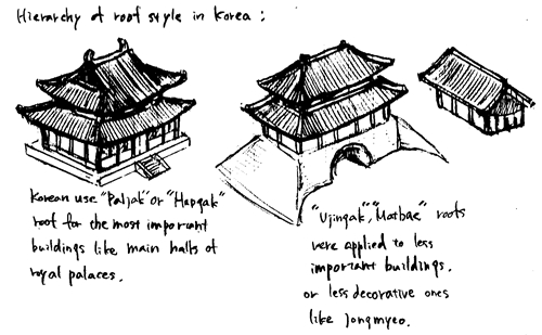 한편, 중국에 있어 유사 이래 일관해서 기동이 최고 격식에 자리 매김되어 왔다. 이 때문에, 궁전에서도 대규모 사원에 대해도, 중심이 되는 건물은 원칙으로서 기동이 된다. 이것에 대해서 한국에서는 반대로 궁전의 정전 등 최고 격식이 요구되는 건물에 반드시 입안방 지붕을 이용하는, 비중국적인 건축 문화를 견지 계속 했다. 아스카 시대의 일본의 사원 건축이, 그 자체 완전한 외래 문화면서, 중국의 원칙에 따라서 않은 것도, 도입에 임하여 직접 참조된 한삼국의 건축 문화의 영향이라고 보면 불가사의는 없다.