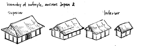 우선, 대충 모아 두자. 일본에서 가장 격식의 높은 건물--예를 들면 시신전이나 대극전 (헤이안 시대의 정전)--에 입안방 지붕을 이용하는 것은, 헤이안 시대 후기 이후는 사실로서 확인할 수 있다. 또 낡은 시대에 있어도, 원래는 「마야」라고 불려 「아즈 마야」의 상위에 놓여진 뱃집지붕 건물이, 차양을 부가하는 기법의 도입을 거치고, (사면차양의 귀결로서의) 입안방의 열위에 놓여지게 된 것도 분명하다. 상고의 뱃집지붕 숭경의 문화는 이후, 신도의 의고적 양식에 그 아쉬움을 두게 된다.