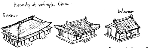 これに対し中国では有史以来、一貫して寄棟が最も高級な屋根形式と位置づけられた。 切妻は最も簡易な屋根形式として劣位に置かれ、入母屋は寄棟と切妻の中間的な形式と位置づけられる。 こうした序列を反映し、中国においては最高の格式を与えられる宮殿の中心建築が寄棟となるのは勿論のこと、寺院においてもその中心建築は原則として寄棟であった。