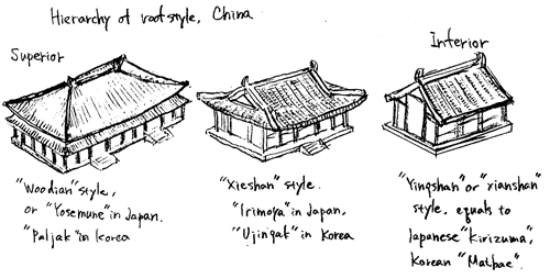 いっぽう、中国においては有史以来一貫して寄棟が最高格式に位置づけられてきた。 このため、宮殿でも大規模寺院においても、中心となる建物は原則として寄棟となる。 これに対して韓国では逆に宮殿の正殿など最高格式が求められる建物に必ず入母屋屋根を用いる、非中国的な建築文化を堅持し続けた。 飛鳥時代の日本の寺院建築が、それ自体まったくの外来文化でありながら、中国の原則に従っていないのも、導入に際して直接に参照された韓三国の建築文化の影響と見れば不思議はない。