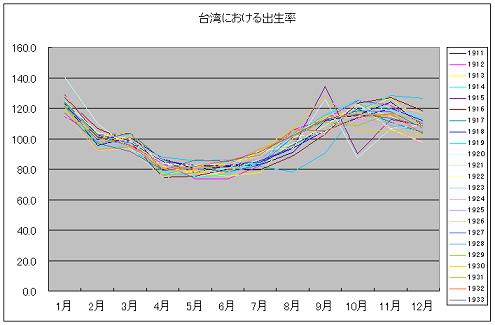 대만은 분명히 1월에 피크가 있어, 2월에 급격한 침체해, 3월 정원않고 게 되돌리는 것도 6월까지는 내리는 경향을 보여9-12약간 혼란은 있는 것의 상승한다고 하는 알기 쉬운 것이 되었습니다.만약 계절적인 불임등이 있다면, 비교적 온난하고 병이 적은 1월에 출산의 피크가 있어, 그 후 더워지기 위해서 출산이 줄어 들어, 기온이 내리면 또 출산이 회복한다, 라고 봐도 좋다고 생각합니다.사회적인 것이 있다면, 음력설전에 태어나는 아이가 대부분, 정월을 맞이하면 단번에 감소하고 있다, 라고 봐도 괜찮을지도 모릅니다.
