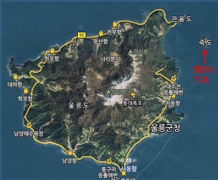 ( 傘(于山)と武陵(武陵) 2島が現のすぐ東中央にある. - 2島がお互いに距離が遠くなくて, 天気が晴れれば よく眺めることができる.)