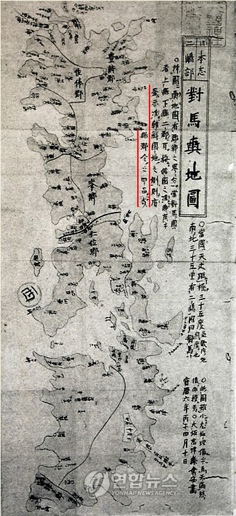이 지도의 점선 안에는 [ 釜示准朝鮮國地之例則府鄕郡令之470里 (부시준조선국지지례칙부향군령지); 조선의 땅 끝 부산에 보여서 이르는 대마도(對馬島)의 府·鄕·郡(부·향·군) 모든 법칙은(所有法律) 朝鮮國(조선국) 현재의 부산시(釜山市)에 준한다. ]라고 기록되어 있다.